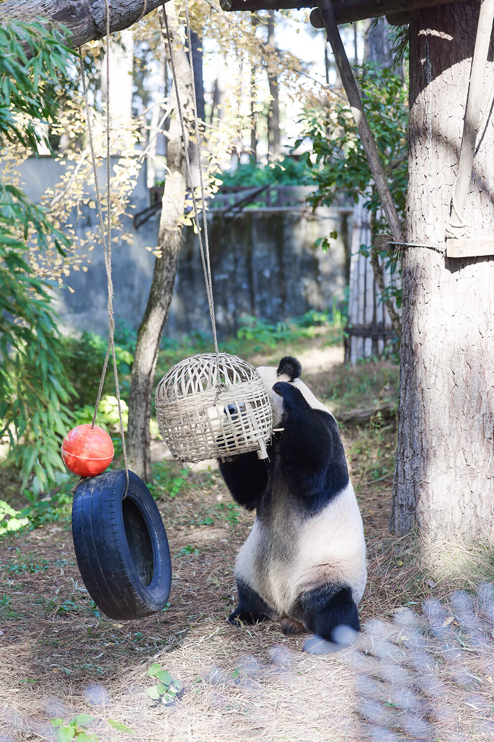 安吉大熊貓館是目前世界一流的大熊貓專業(yè)生態(tài)展館,整個(gè)熊貓館面積大約3400平方米,硬件投資400多萬(wàn)元。大熊貓住的地方是嚴(yán)格按照專家建議設(shè)計(jì)建造的,其中各項(xiàng)功能齊全。比如,大熊貓怕熱不怕冷,80平方米的室內(nèi)館就設(shè)置成了恒溫室,室外氣溫一旦超過(guò)26攝氏度,它們就要進(jìn)去享受空調(diào)了。此外,大熊貓喜歡爬樹(shù),偶爾也要玩玩游戲,兩個(gè)500多平方米的室外館安裝了樹(shù)架、游樂(lè)設(shè)施,專供它們健身悠閑之用。